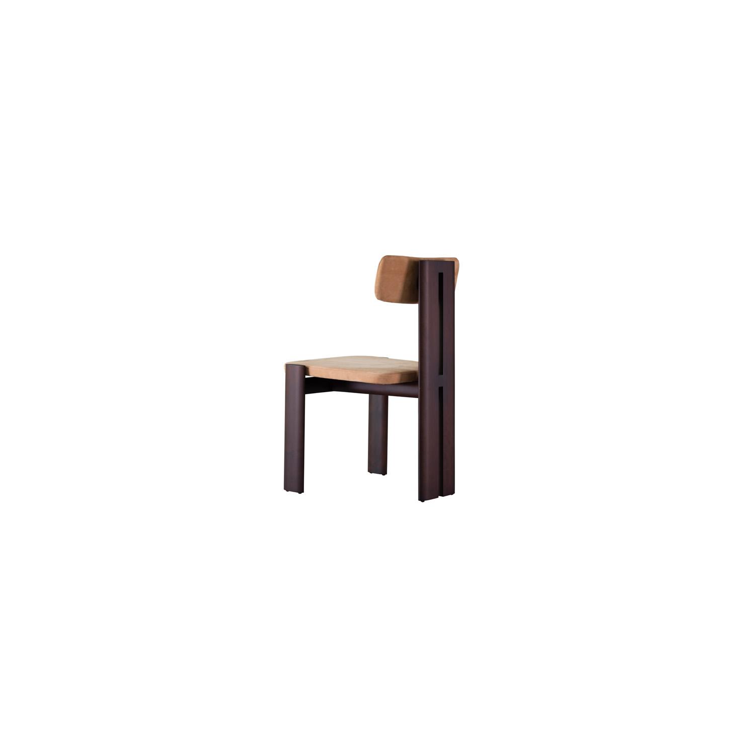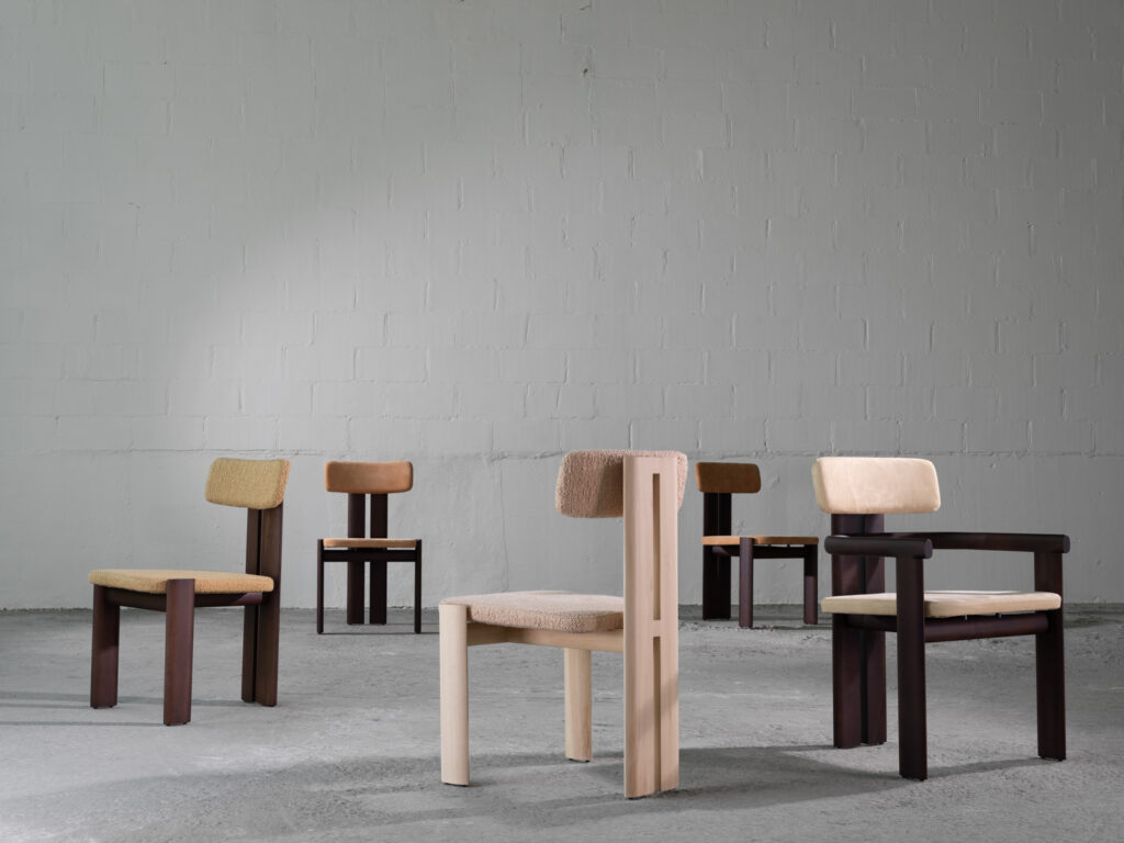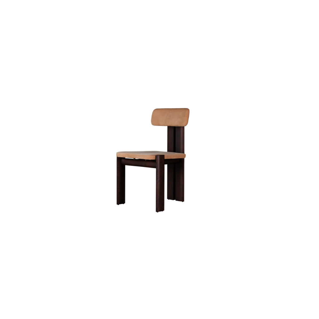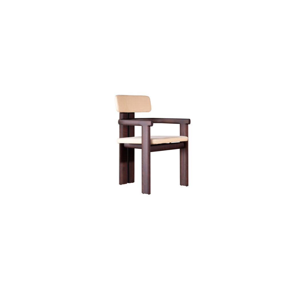 A estrutura do encosto formado por dois pés paralelos confere uma força estética e robustez a peça, enquanto os pés frontais em perfil elíptico destacam a beleza natural da madeira e evidencia a aplicação de técnicas tradicionais de marcenaria.